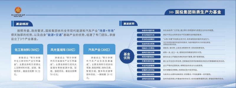 為落實(shí)我市構(gòu)筑“四個(gè)世界級(jí)產(chǎn)業(yè)”和培育戰(zhàn)略性新興產(chǎn)業(yè)的決策部署,市國(guó)投集團(tuán)于2024年開始,承接設(shè)立總規(guī)模120億元的三支產(chǎn)業(yè)基金——鄂爾多斯市化工新材料產(chǎn)業(yè)引導(dǎo)基金(總規(guī)模50億元)、風(fēng)光氫儲(chǔ)車產(chǎn)業(yè)引導(dǎo)基金(總規(guī)模50億元)和鄂爾多斯市汽車生態(tài)產(chǎn)業(yè)發(fā)展基金(總...