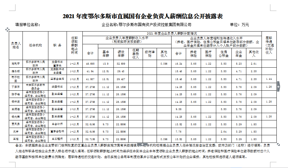 2021年度鄂爾多斯市直屬國有企業(yè)負責人薪酬信息公開披露表