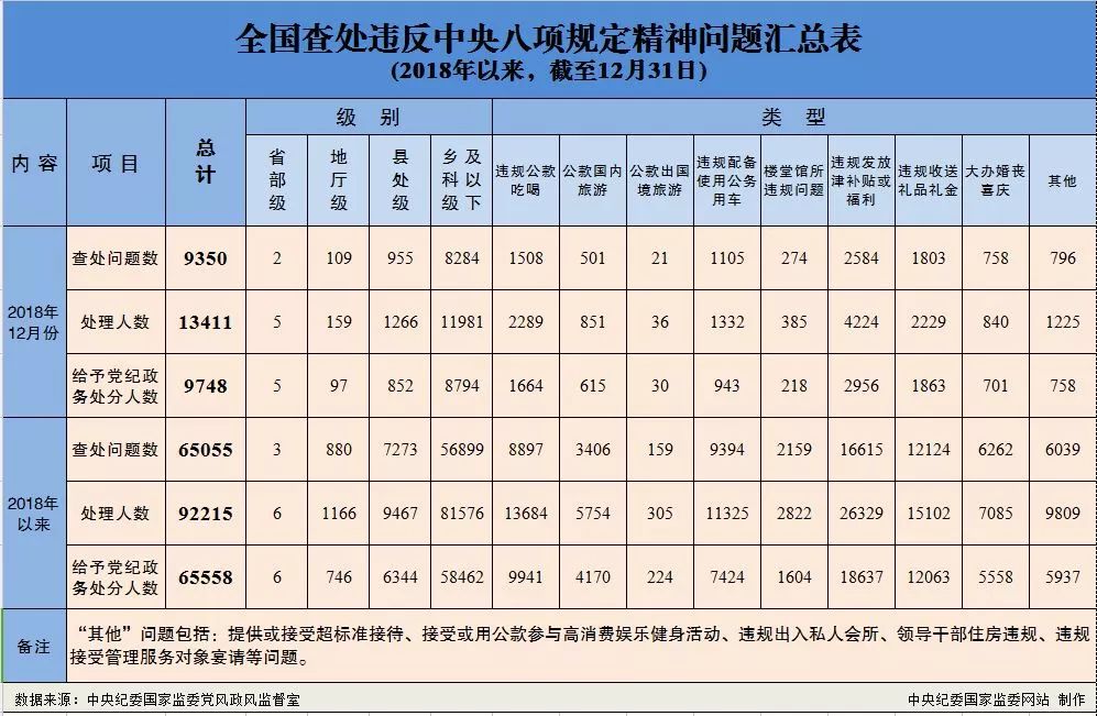 ??????為掌握全國貫徹落實中央八項規(guī)定精神情況,中央紀委在各省區(qū)市和新疆生產(chǎn)建設(shè)兵團、各中央和國家機關(guān)、各中央企業(yè)和中央金融企業(yè)等建立了落實中央八項規(guī)定精神情況月報制度.2018年以來,截至12月31日,全國查處違反中央八項規(guī)定精神問題情況如下: