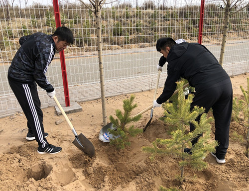 ?揭牌儀式結(jié)束后,國(guó)投青年職工們自發(fā)組隊(duì),各有分工,有的揮鋤挖土,有的扶苗填坑,有的揮鍬培土,有的夯實(shí)土層,植樹活動(dòng)如火如荼地進(jìn)行著。經(jīng)過兩個(gè)多小時(shí)的共同勞作,共栽種了近一百株松樹苗。